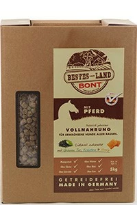 Zusammensetzung: 31% Pferdefleisch (getrocknet u. gemahlen – entspr. 718g Frischfleisch pro 1000g Vollnahrung), Kartoffelmehl, Kartoffelflock- en, Rapsö,l, Apfel, 1% Honig, 1% Grüner Tee, 1% Kokosö,l, Pastinaken, Karotte, Kamille, Brennessel, Schwarzkümmel, Johannisbrotkernmehl, Mineralstoffe