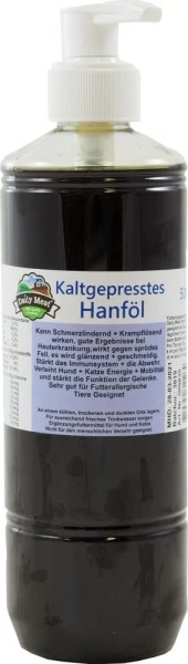 100% Naturprodukt ohne jegliche Zusätze. Hanföl hat eine perfekte Mischung aus Omega 3 und 6 Fettsäuren. Es hat eine positive Wirkung auf das Immunsystem, hilft bei Gelenkproblemen und ergibt ein außergewöhnlich glänzendes Fell.