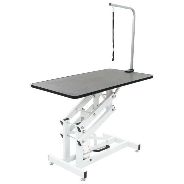 Dieser Trimmtisch ist ideal für Fellpflege zu Hause, unterwegs oder bei Hundeausstellungen. Er verfügt über eine rutschfeste Tischplatte und einen pulverbeschichteten Eisenrahmen mit einem verstellbaren Trimmgalgen und verstellbaren Füßen. Dieser professionelle, hydraulische, faltbare Trimmtisch ist vielseitig und bringt Komfort zu jeder Pflegesituation. Die Tischplatte mit einer rutschfesten Gummi-Oberfläche schafft eine angenehme Oberfläche für Ihre Haustiere zu stehen, während sie gepflegt werden. Zusätzlich ist der Trimmgalgen mit hochbeanspruchbarer Qualität praktisch zu demontieren, wenn er nicht verwendet wird, für eine einfache Lagerung und einen leichten Transport. Abgesehen davon ermöglicht das hydraulische Design den Füßen, die ideale Höhenverstellung einzustellen. Die verstellbare Trimm-Schlaufe hält Haustiere auf sichere Weise zurück und verfügt über ein verbessertes Verriegelungsschieber-Schnappschloss. Zu dem Lieferumfang gehören 1 x Trimmtisch, 1 x Clamp-on einstellbarer Trimmgalgen und 1 x Trimm-Schalufe.